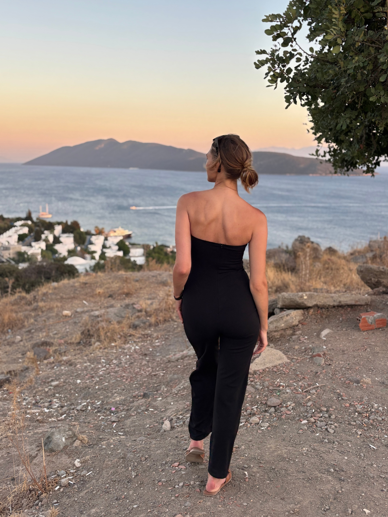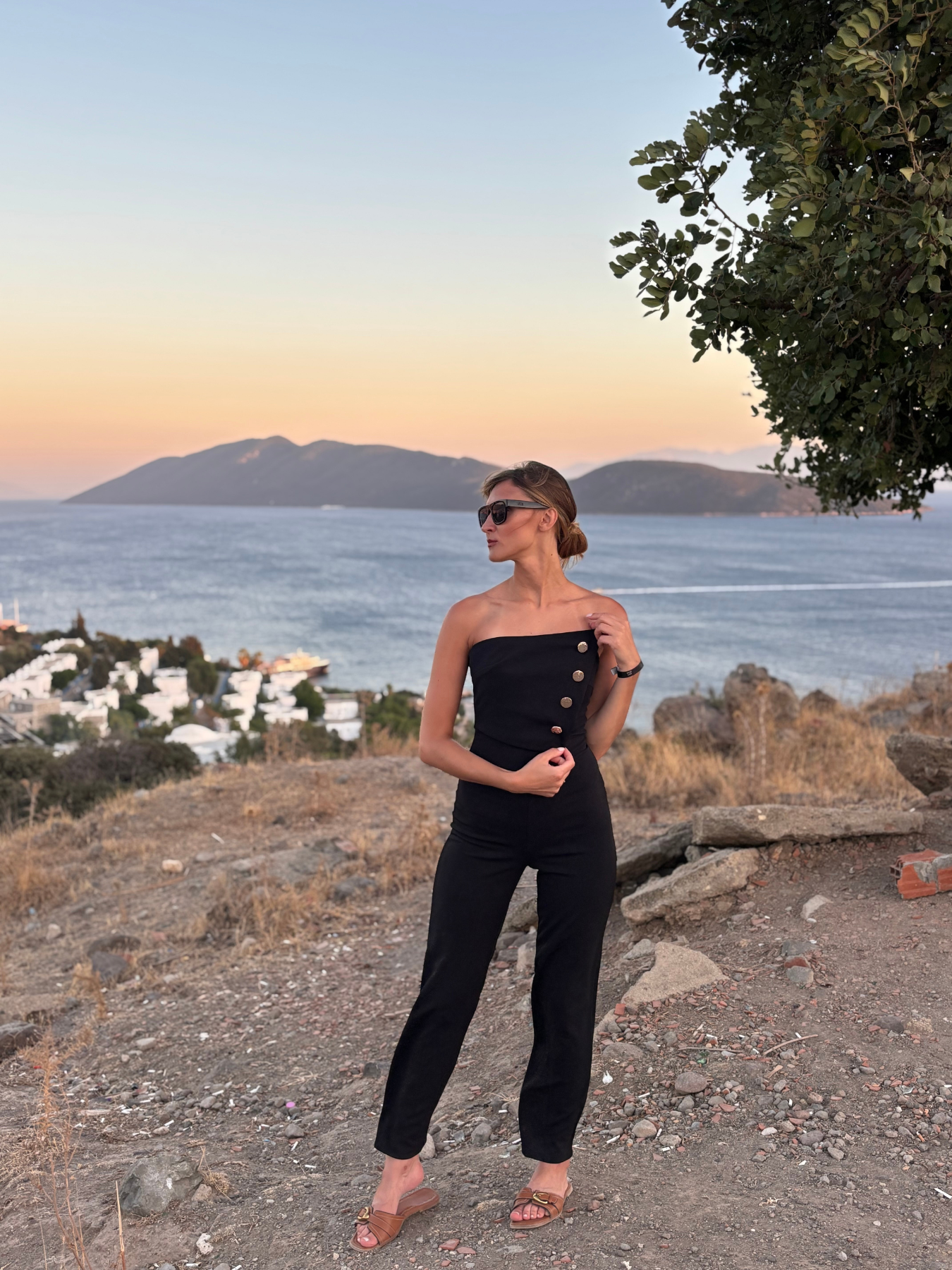 „Elegant Touch” to nowoczesna interpretacja zmysłowej elegancji. Kombinezon, który łączy minimalizm z kobiecą siłą i sprawia, że sylwetka wygląda smukło oraz proporcjonalnie bez zbędnego wysiłku. Góra bez ramiączek subtelnie eksponuje linię ramion i dodaje stylizacji lekkości, a ozdobne guziki oraz zakładka inspirowana marynarką nadają całości eleganckiego, dopracowanego charakteru. Podkreślona talia pięknie modeluje figurę i akcentuje wcięcie, dzięki czemu całość prezentuje się kobieco i stylowo.