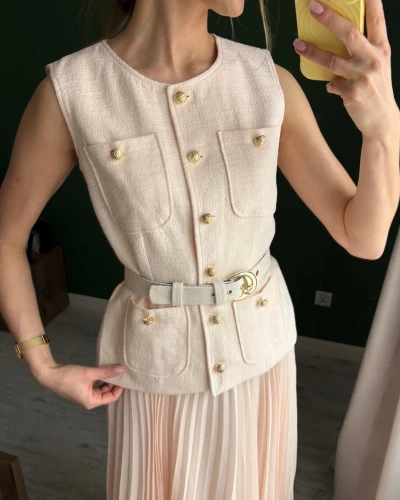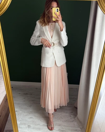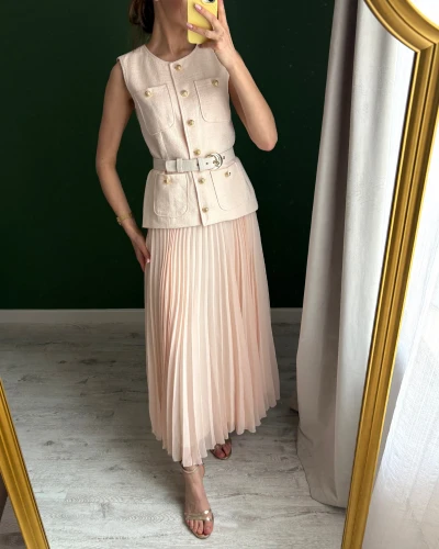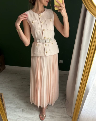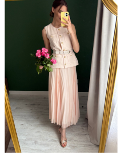 Verona to wyjątkowy, elegancki komplet, który łączy w sobie klasykę i nowoczesny szyk. Składa się z dopasowanej kamizelki z paskiem oraz plisowanej spódnicy o idealnej długości – razem tworzą spójną, harmonijną całość, ale z łatwością możesz je także stylizować osobno.