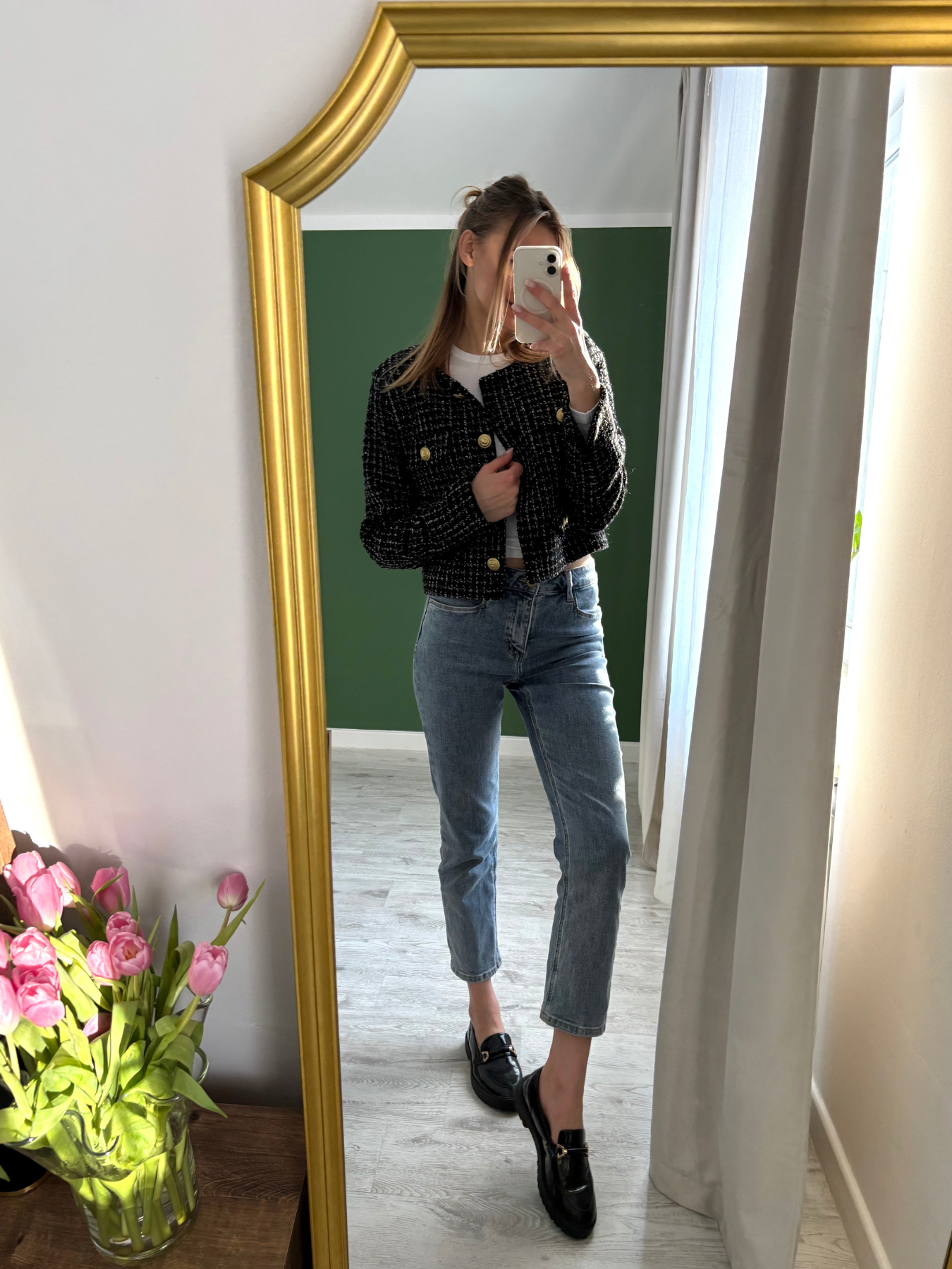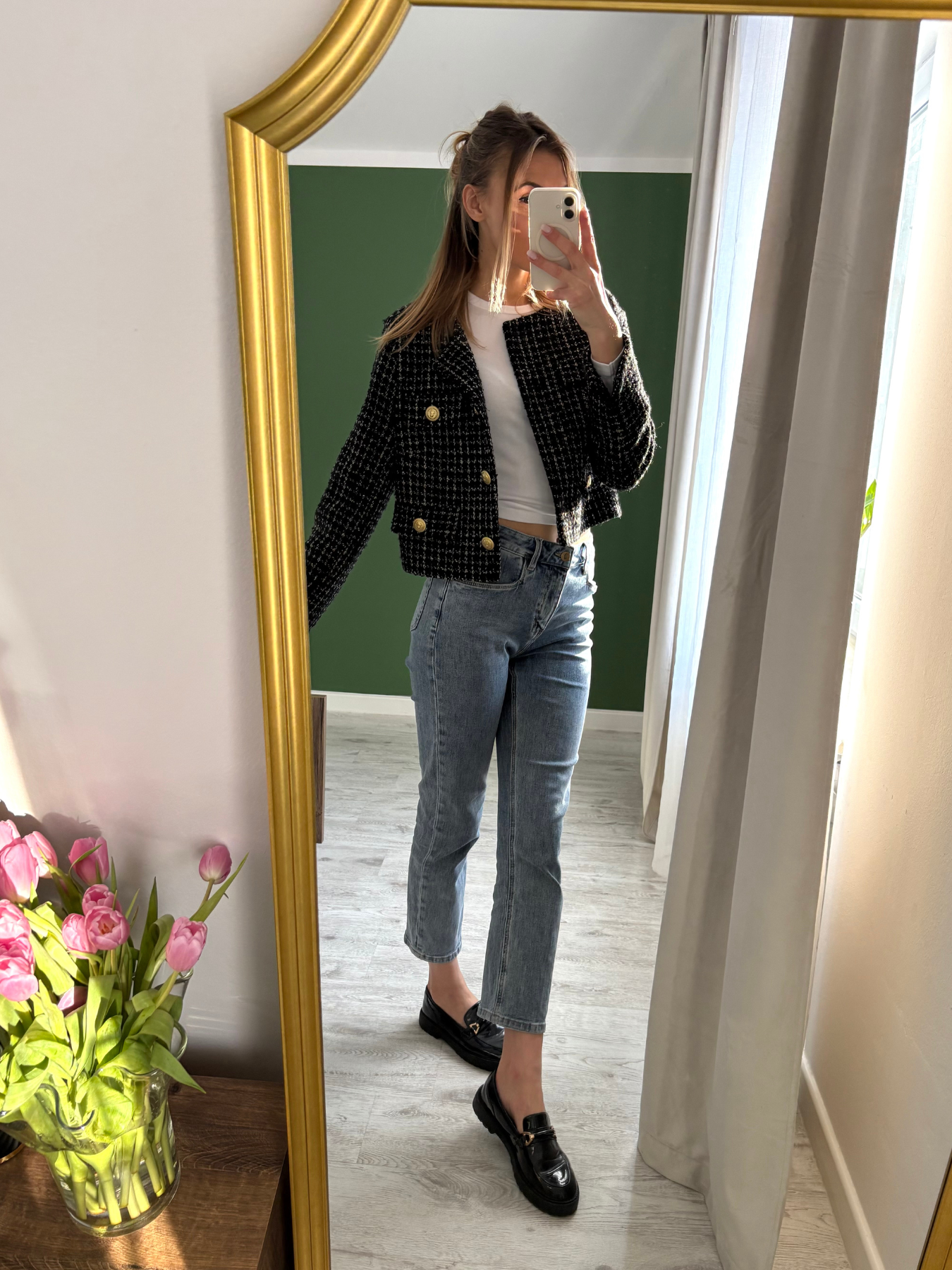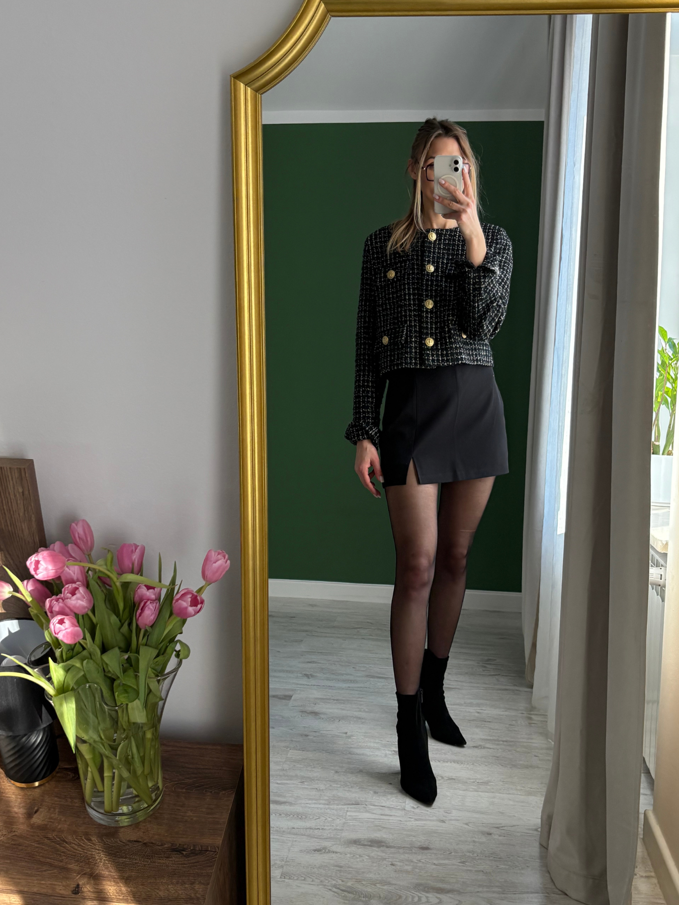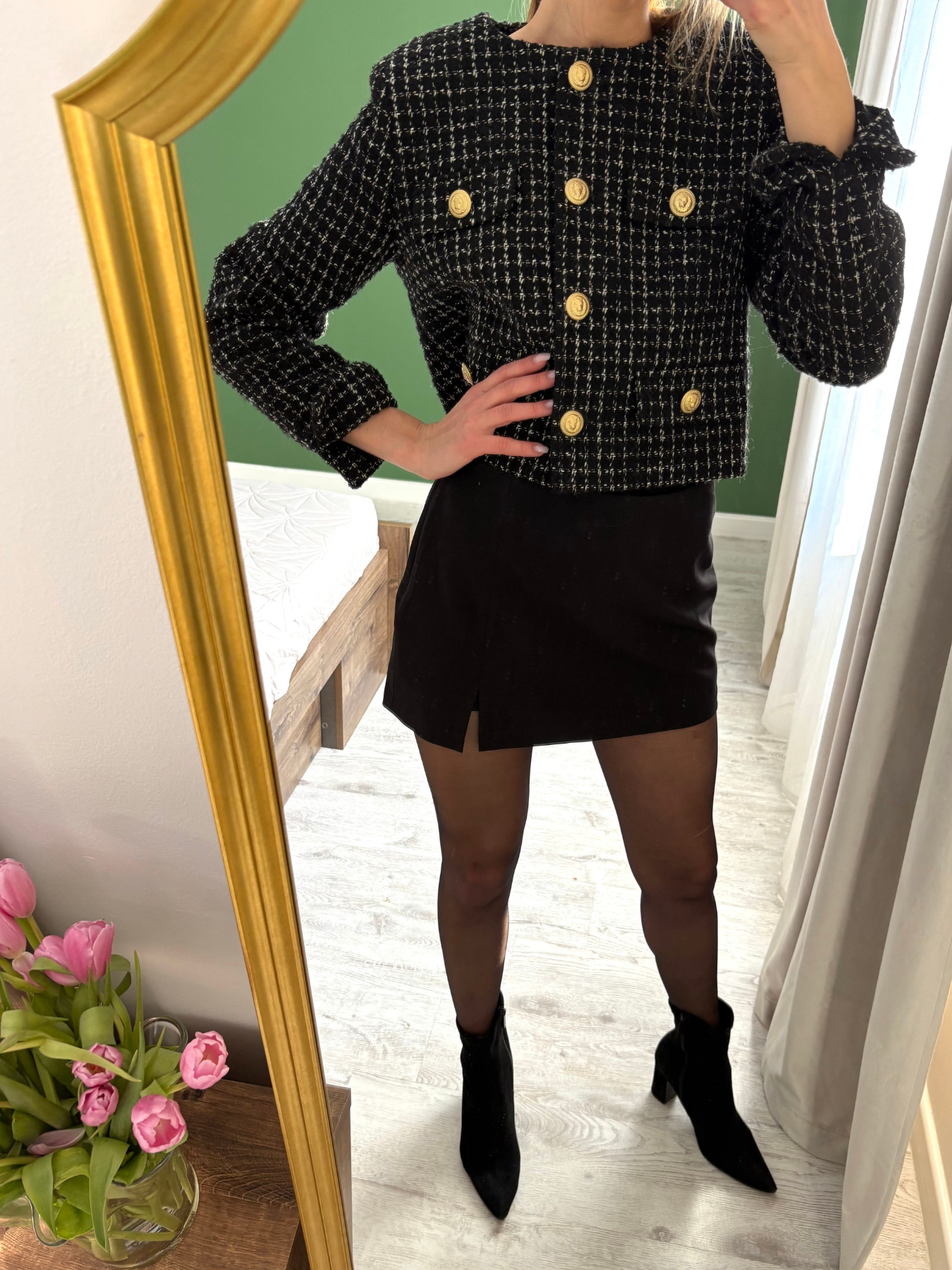Klasyczna krata w połączeniu ze złotymi guzikami tworzy szlachetny, kobiecy akcent, który przyciąga uwagę, ale pozostaje elegancki i wyważony. Krótszy fason podkreśla talię i świetnie współgra zarówno ze spodniami z wysokim stanem, jak i mini spódnicą czy jeansami.