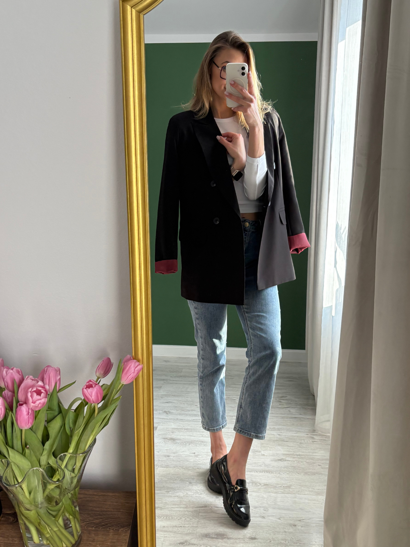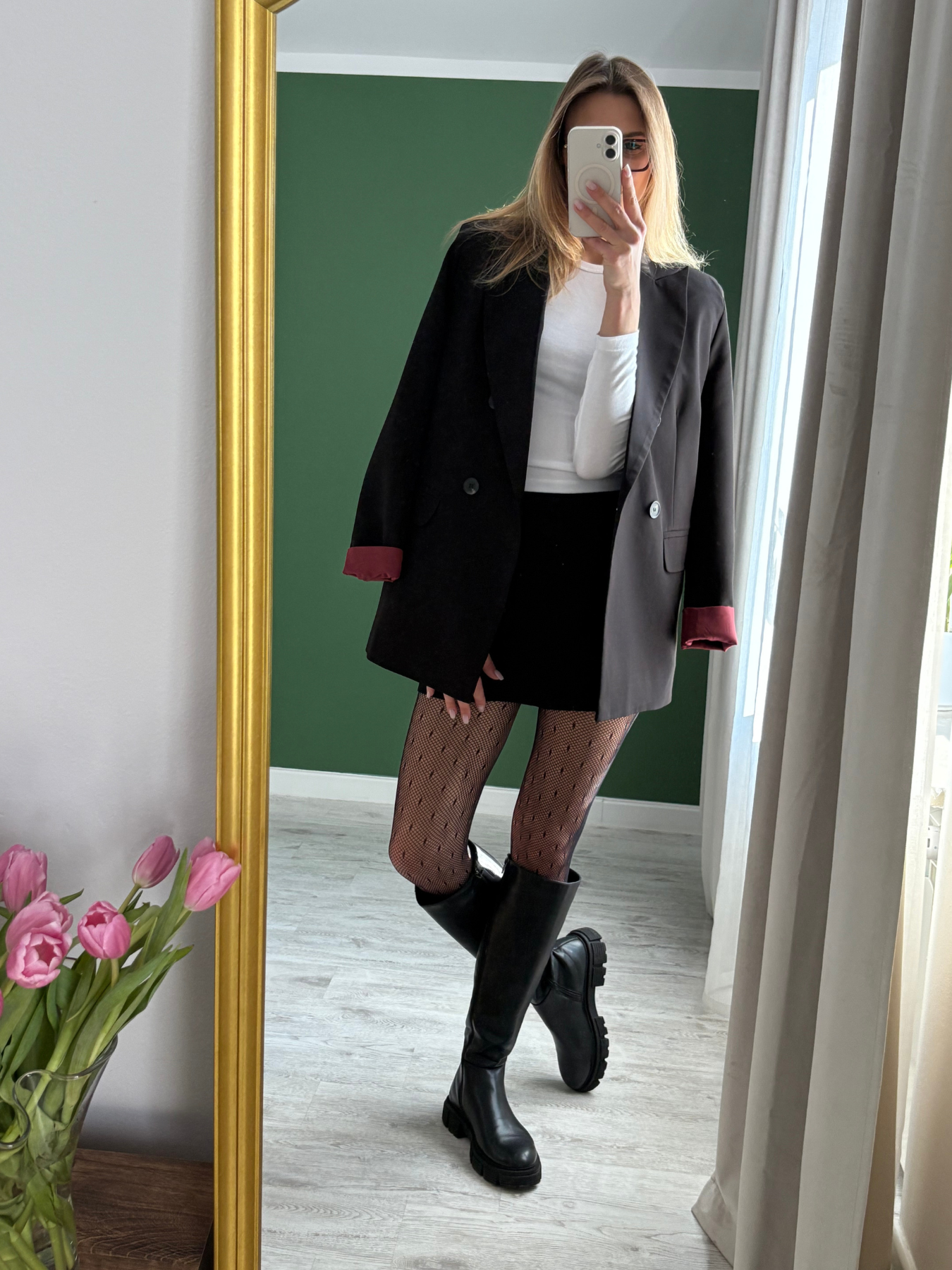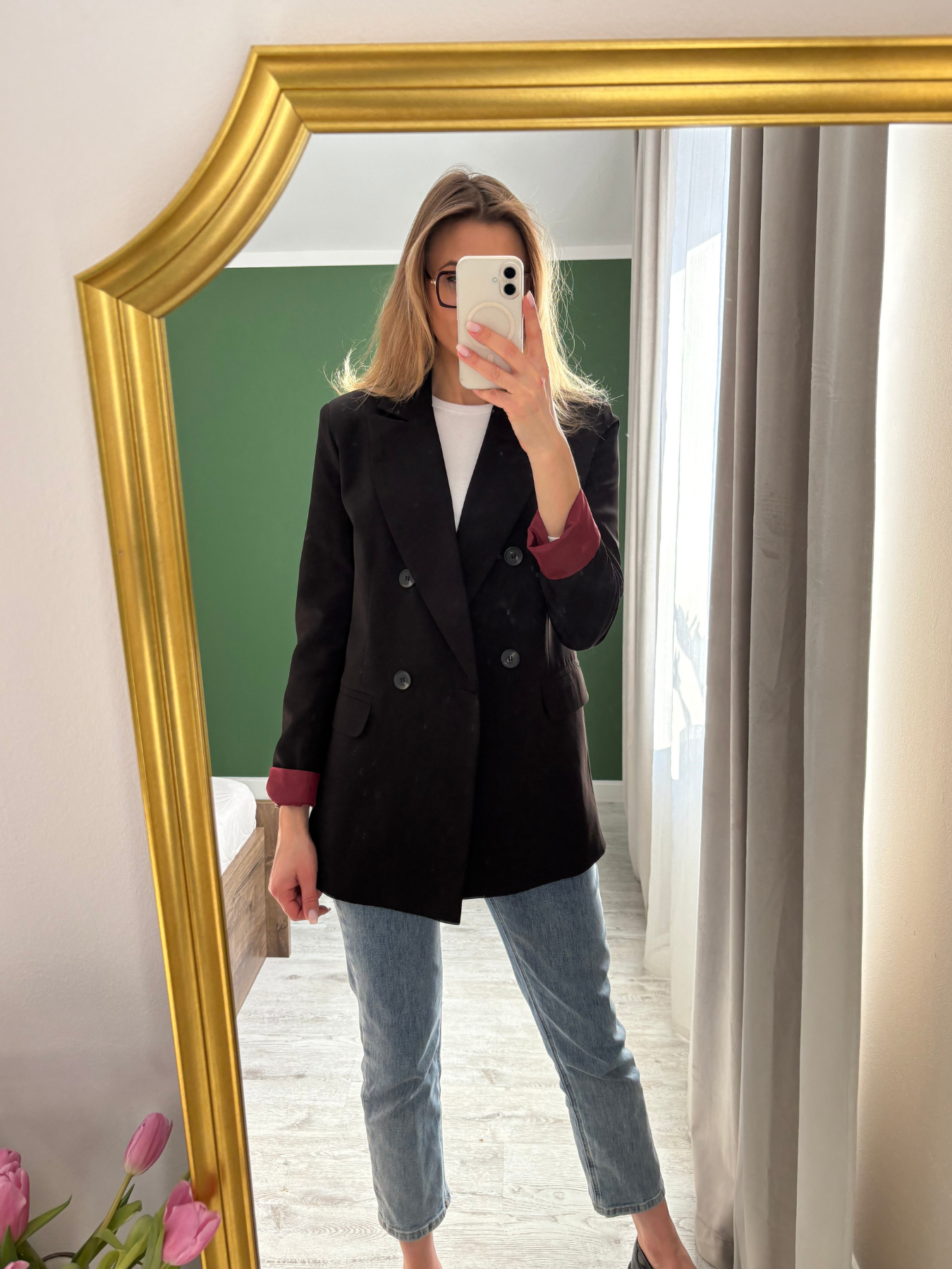 Kontrastowa, bordowa podszewka została wykończona również przy rękawach — po podwinięciu mankietu subtelnie odsłania kolor, tworząc efektowny detal widoczny w ruchu. To drobny akcent, który sprawia, że stylizacja nabiera charakteru, pozostając elegancka i minimalistyczna.