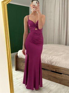 Sukienka "Berni" to olśniewająca maxi w odcieniu głębokiego fioletu, która łączy elegancję z subtelną zmysłowością. Dopasowany krój pięknie modeluje sylwetkę, podkreśla talię i nadaje figurze harmonijnych proporcji. Motylkowy dekolt akcentuje biust, a odkryte plecy z wiązaniem dodają całości lekkości i przyciągają spojrzenia.