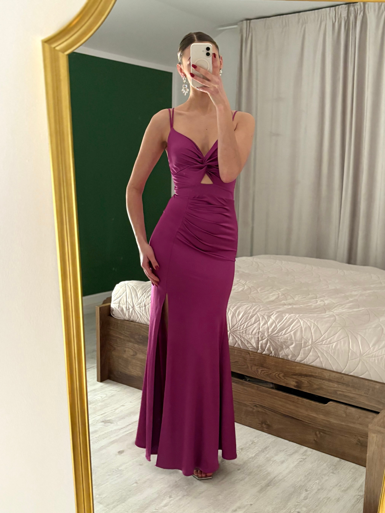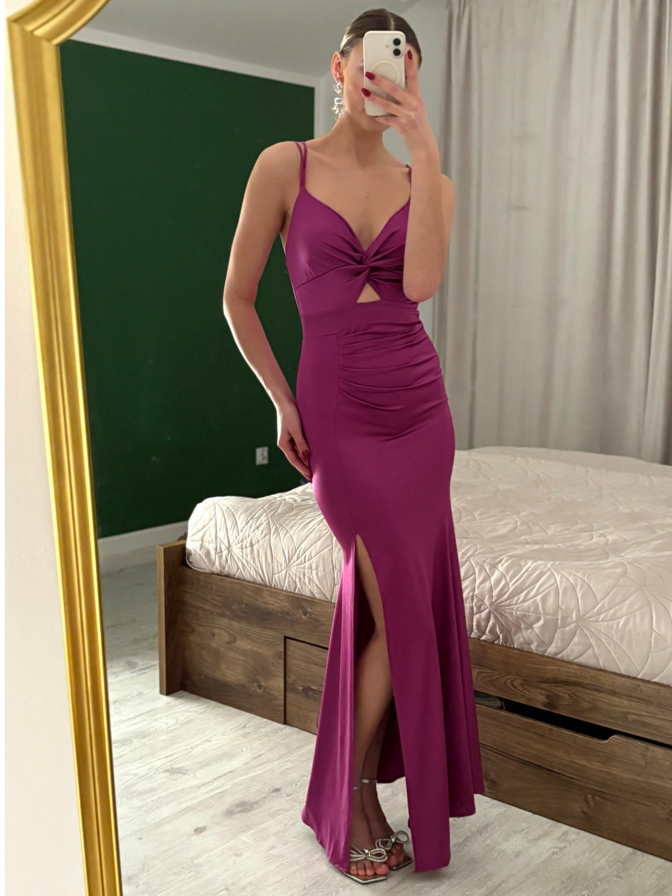 Rozcięcie na nodze nadaje stylizacji kobiecego charakteru i zapewnia swobodę ruchu, a delikatnie połyskujący materiał sprawia, że sukienka prezentuje się wyjątkowo w każdym świetle. To model stworzony na wesela, gale, eleganckie przyjęcia i wszystkie momenty, w których chcesz wyglądać efektownie i z klasą.