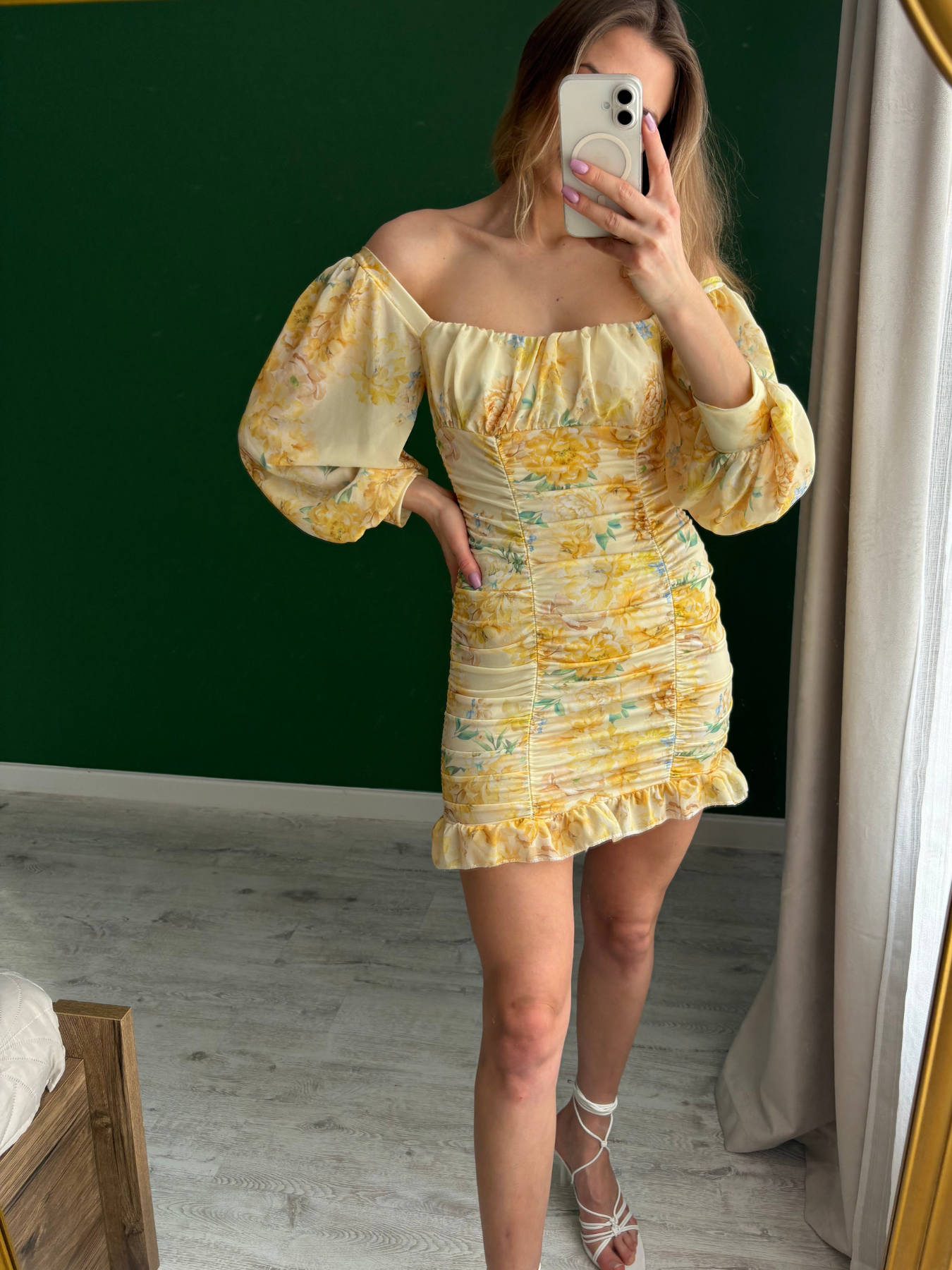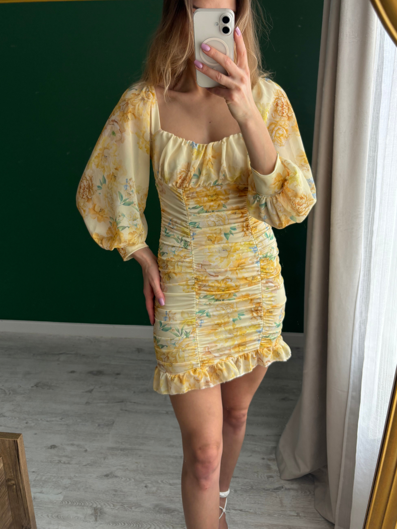 • Kobiecy fason — długość podkreślająca nogi, a marszczenia i falbanka dodają dziewczęcego wdzięku i świeżości.