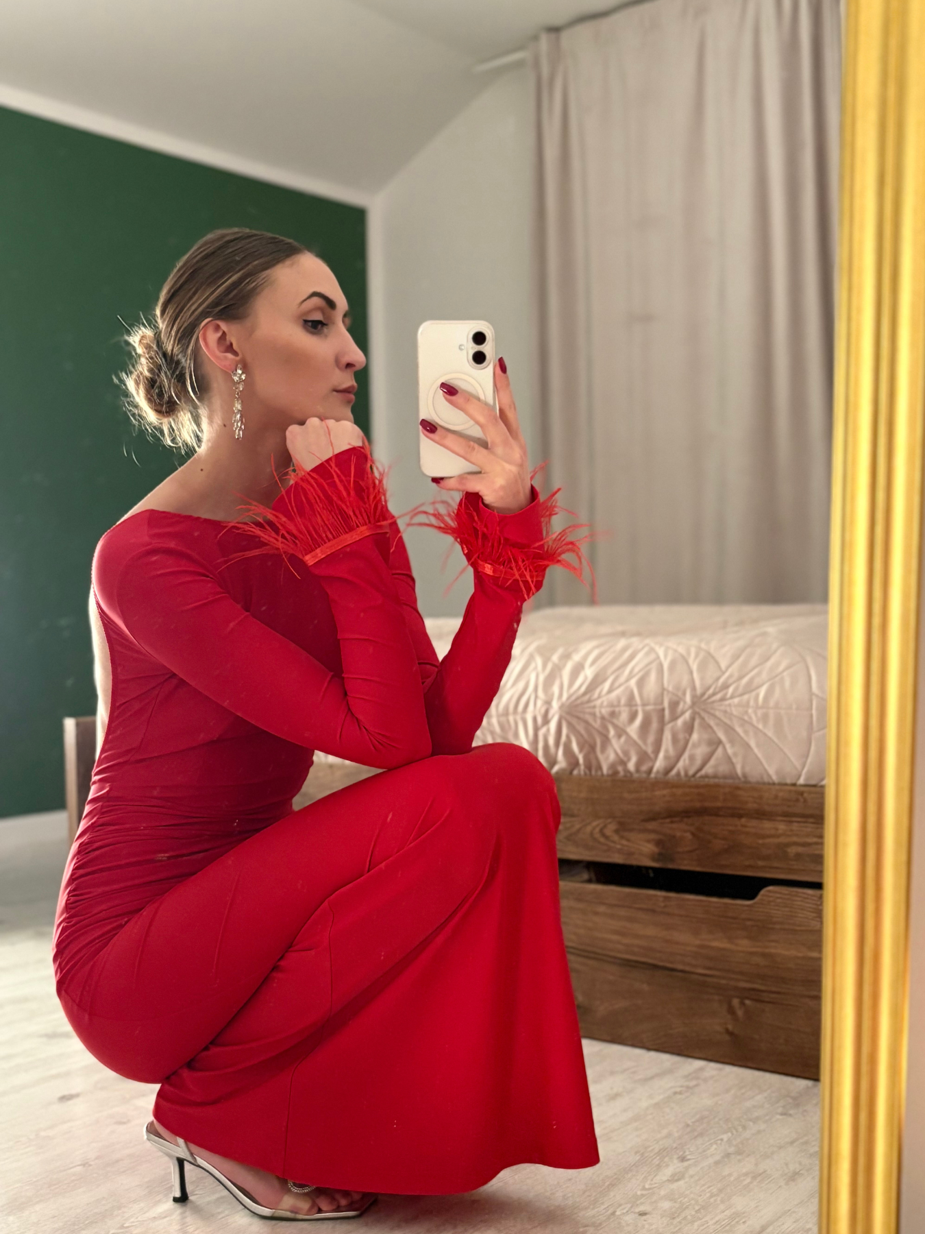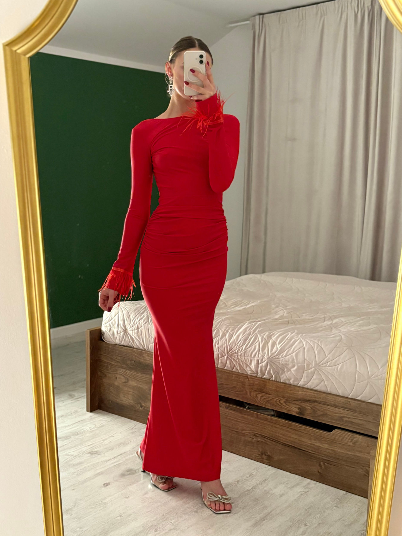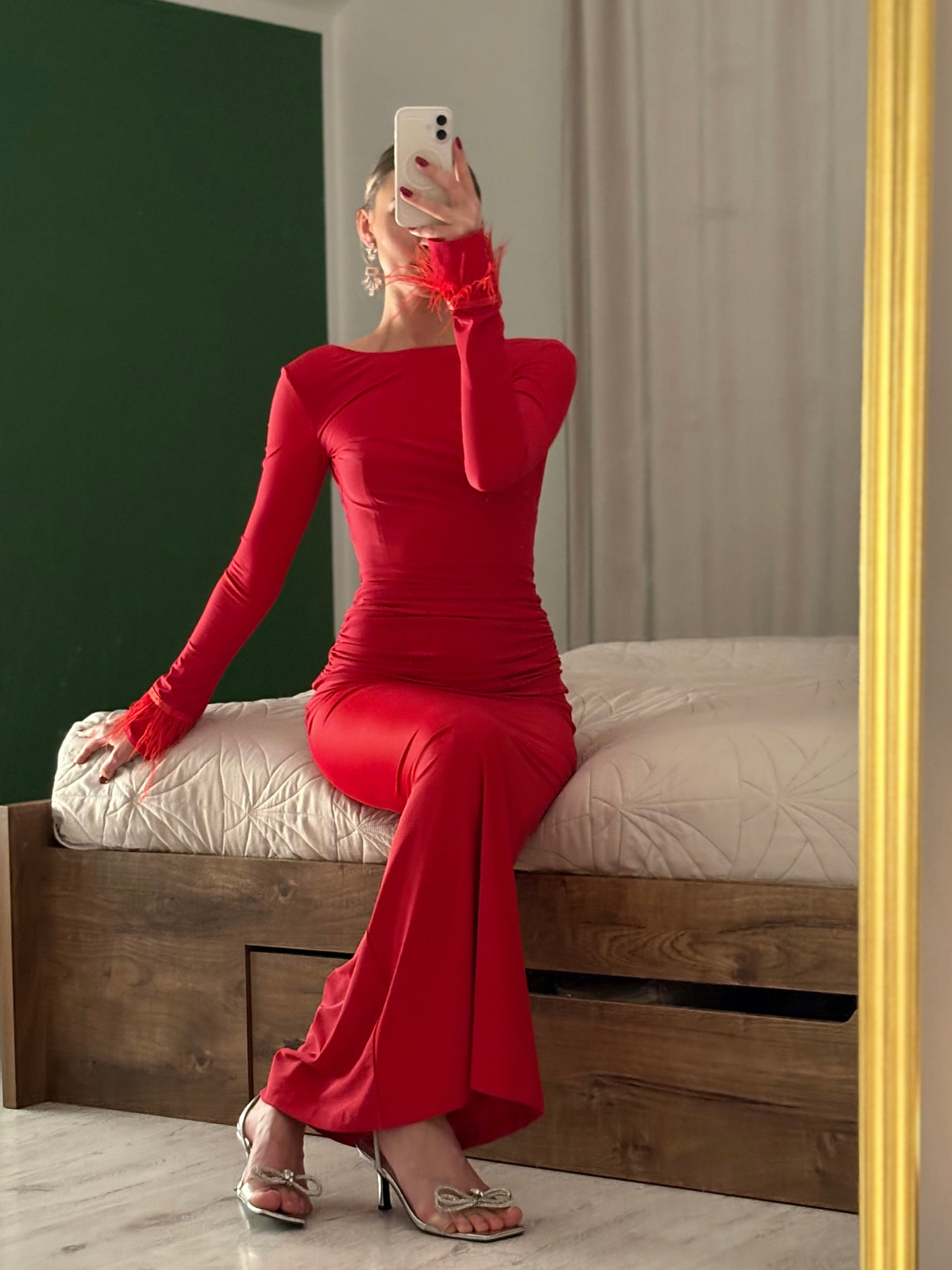 Odkryte plecy nadają stylizacji lekkości i subtelnej sensualności, a rękawy wykończone piórami wprowadzają luksusowy, glamour akcent. Elastyczny materiał pięknie dopasowuje się do ciała, podkreślając talię i biodra, jednocześnie zapewniając komfort noszenia przez cały wieczór.