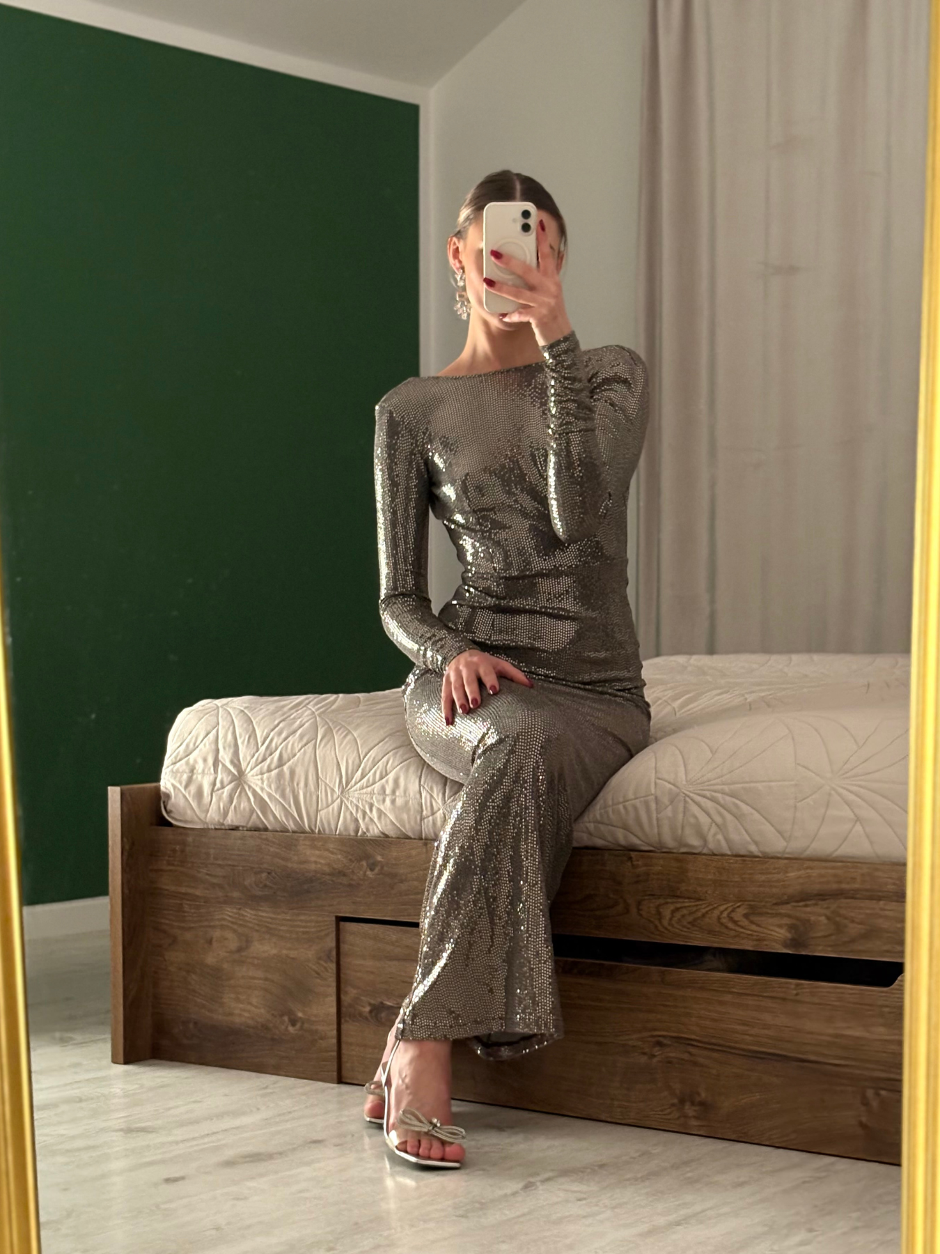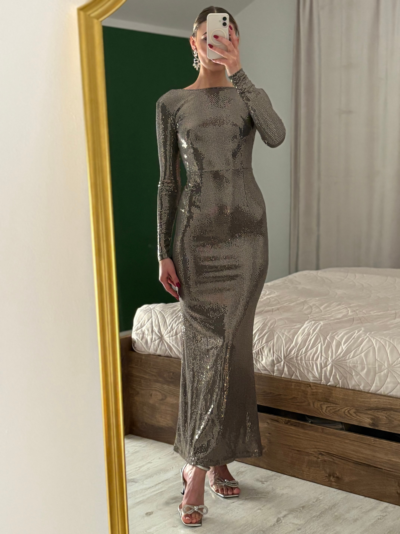 Dopasowany, ołówkowy fason podkreśla talię i biodra, modelując sylwetkę w elegancki, wyważony sposób. Długie rękawy równoważą całość, nadając stylizacji klasy i ponadczasowego szyku, a subtelnie odkryte plecy wprowadzają nutę zmysłowości bez przesady.