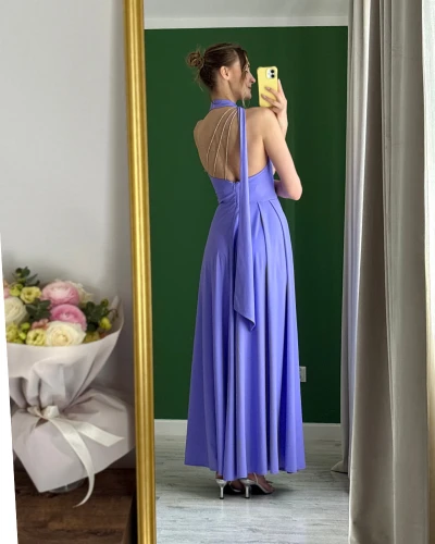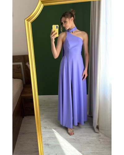 Zmysłowe wiązanie na szyi subtelnie eksponuje ramiona i szyję, nadając sylwetce lekkości i nowoczesnego charakteru. Odkryte plecy z delikatnym zdobieniem przyciągają uwagę w wyważony sposób, a wysokie rozcięcie na nodze modeluje figurę i optycznie wydłuża nogi, zapewniając swobodę ruchu.