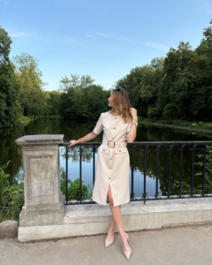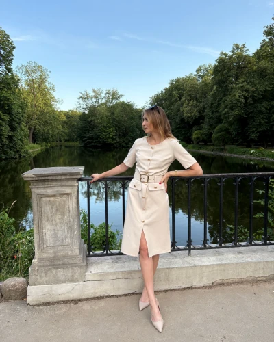 Sukienka "Rosa" w odcieniu cappuccino to połączenie klasy, kobiecości i ponadczasowej elegancji. Ołówkowy fason pięknie podkreśla sylwetkę, modeluje talię i nadaje figurze harmonijnych proporcji, a pasek dodatkowo akcentuje kobiecy kształt. Subtelne, srebrne guziki stanowią elegancki detal, który dodaje całości wyrafinowanego charakteru.